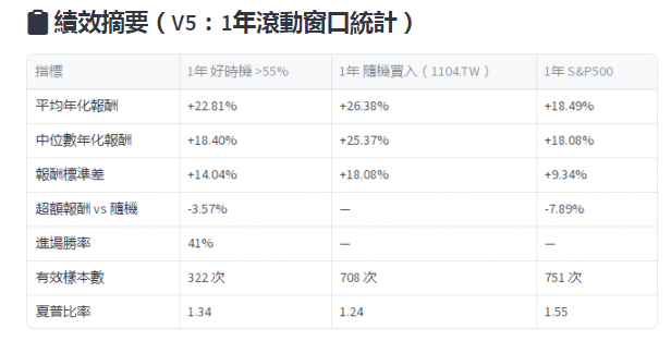這也解釋了為什麼同樣是台股,美股個股(如KO可口可樂)的好時機vs隨機差距會更明顯——美股市場更成熟,均值回歸訊號更清晰,而且沒有台股這5年的系統性大漲作為背景。