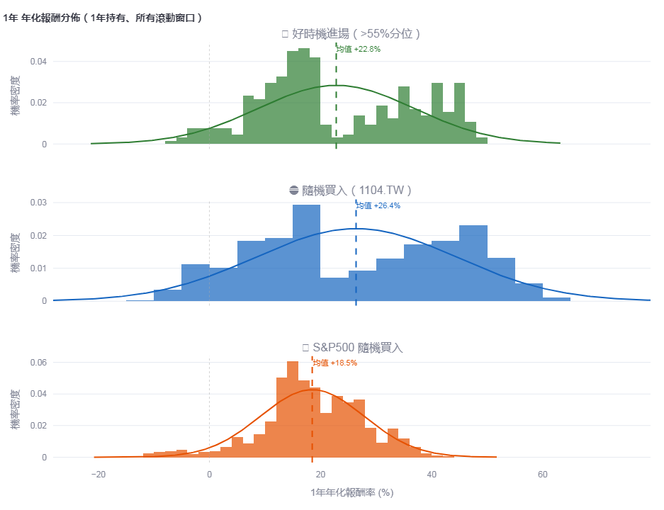 選時機進場,雖然實際平均報酬差不多,但波動更小——意思是你比較不會買在最高點,持有過程比較平穩。